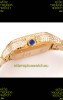 Diamonds Embedded Dial with Roman Hour Numerals, Date Window at 6 O'Clock and Signature Cartier Markings at the 7 O'Clock Counter. Blue Sapphires on Stem Tip