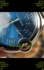 Blue Dial with Roman Hour Numerals, Date Indicator at 3 O'Clock, Signature Cartier Markings at the 7 O'Clock Counter. Blue Sapphires on Stem Tip.
