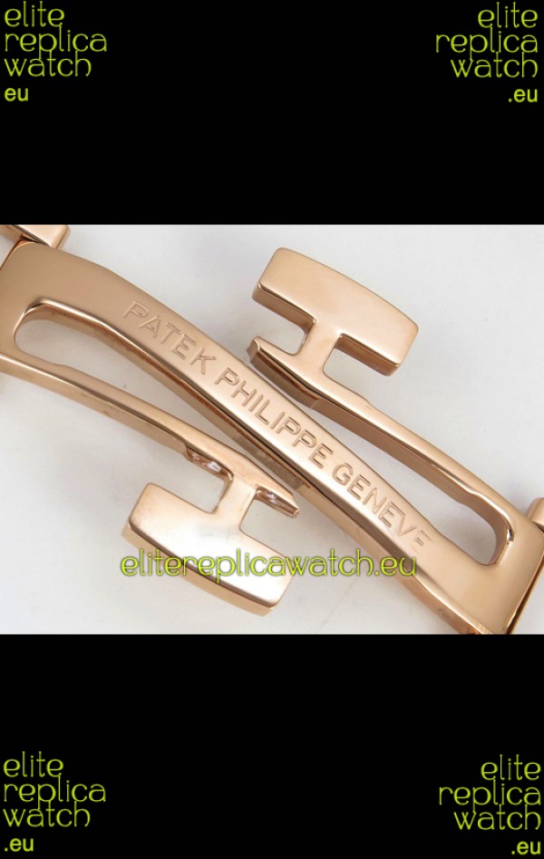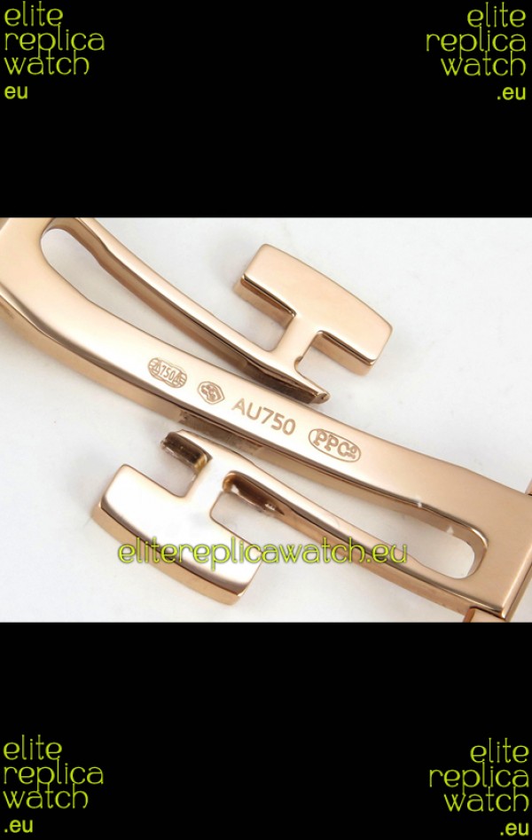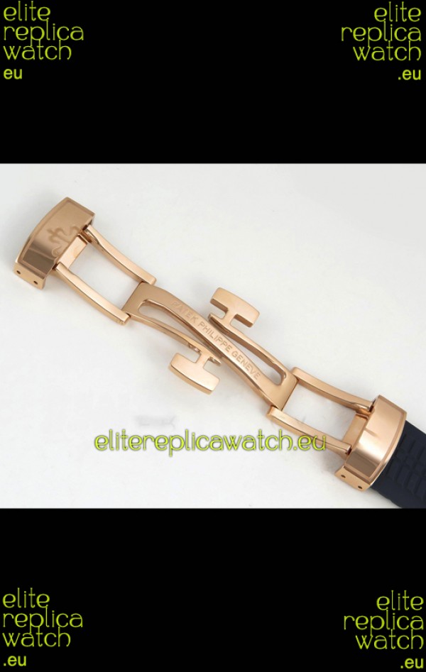 Brown Curved Rubber Strap with Rose Gold Plating on Steel Folding Clasp complete with Patek Philippe Markings. A Highly Updated Clasps for this series with much more accurate markings/engravings.