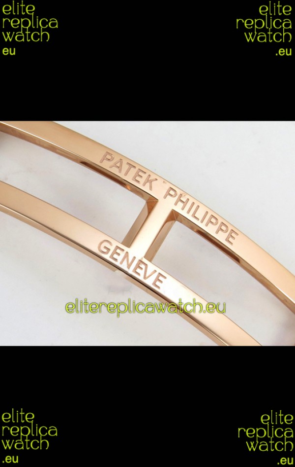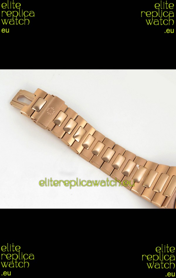 18K Rose Gold Plating on 904L Solid Stainless Steel Strap linked with Screws with Folding Patek Philippe Clasp.