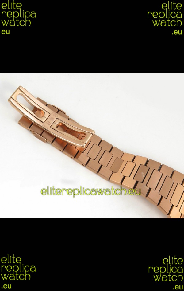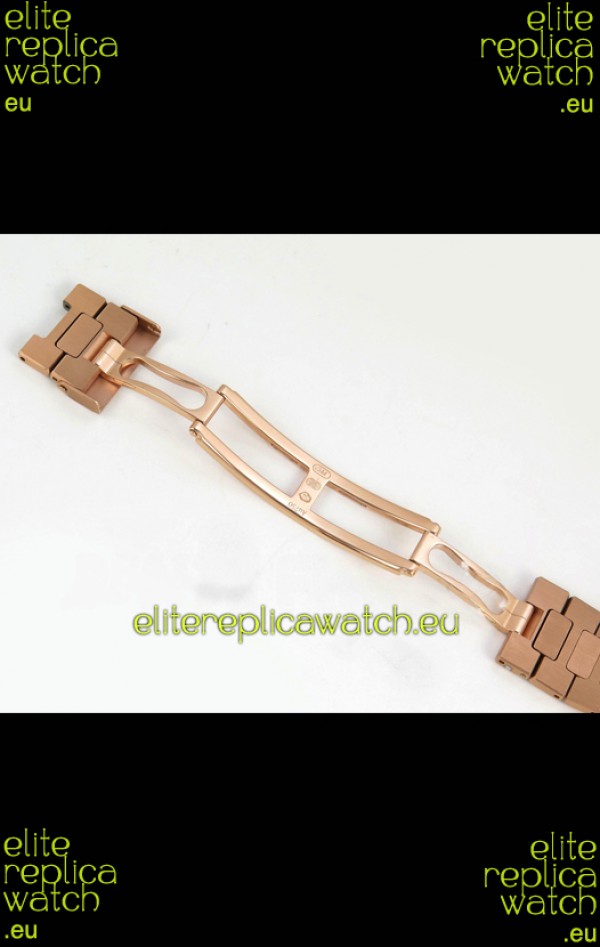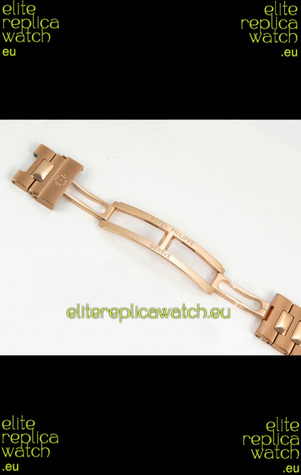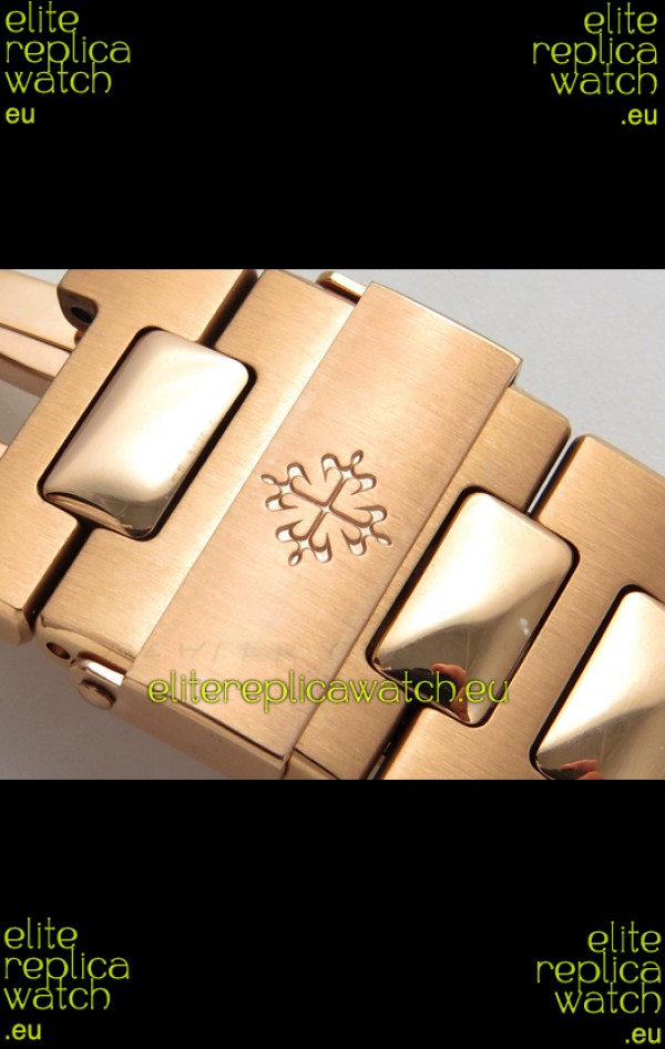 18K Rose Gold Plating on 904L Solid Stainless Steel Strap linked with Screws with Folding Patek Philippe Clasp.