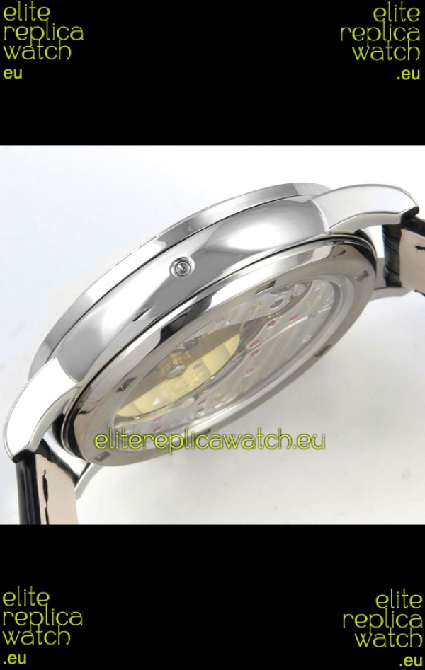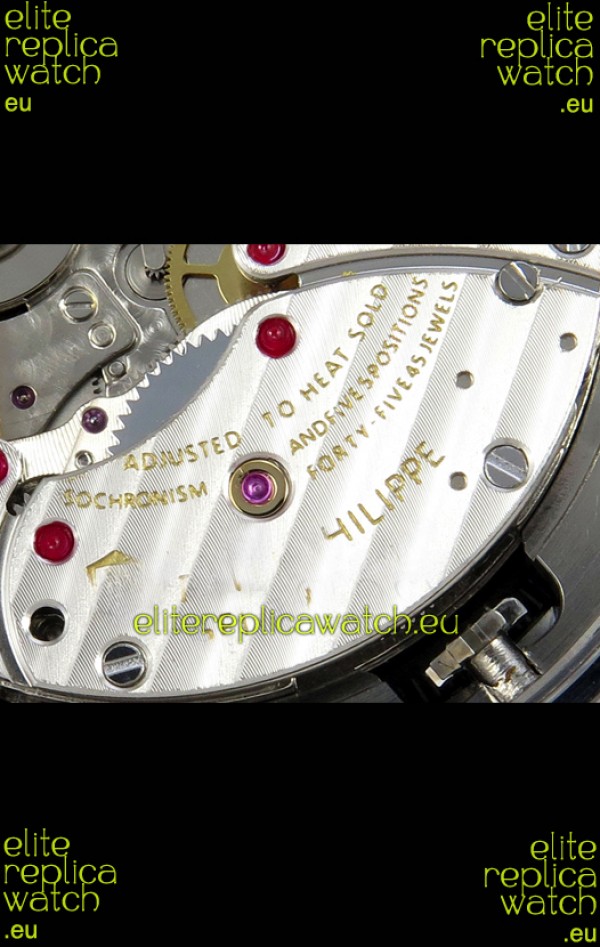 Genuine Swiss 9015 Movement assembled to Resemble the Authentic Patek Philippe PP 240 Calibre Style Movement. Updated Rotor, Bridged and Engravings on Movement with Rose Gold Plated Patek Philippe Stamped Rotor