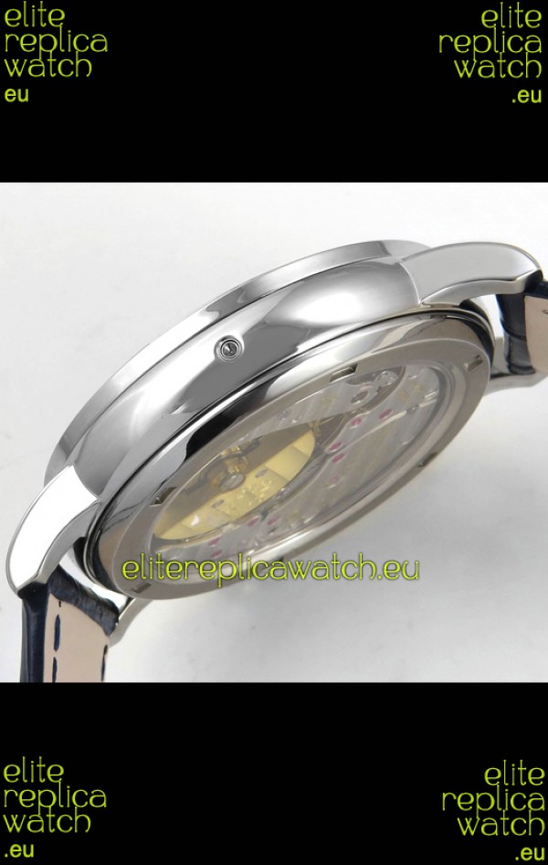 Genuine Swiss 9015 Movement assembled to Resemble the Authentic Patek Philippe PP 240 Calibre Style Movement. Updated Rotor, Bridged and Engravings on Movement with Rose Gold Plated Patek Philippe Stamped Rotor