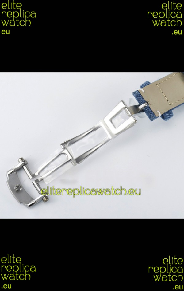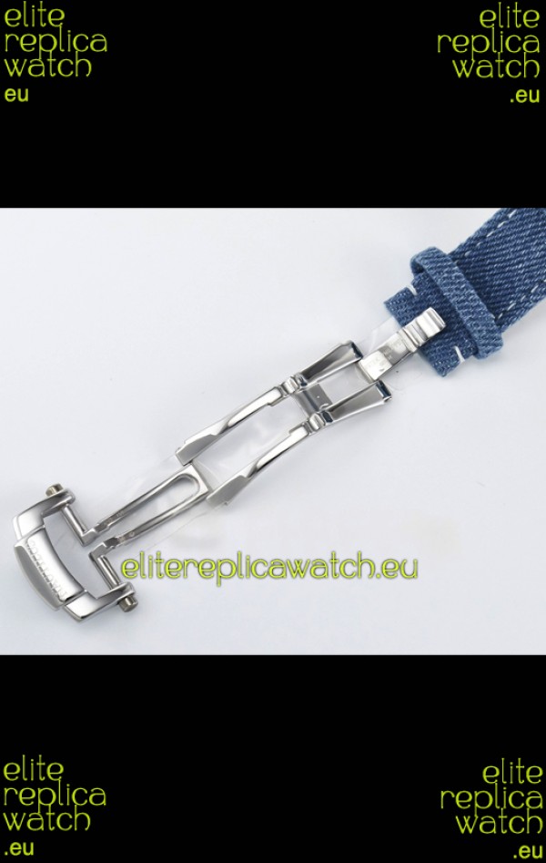 Genuine Fabric/Leather Hybrid Strap in Blue with Double Fold Stainlless Steel Clasps with Patek Philippe Markings/Engravings