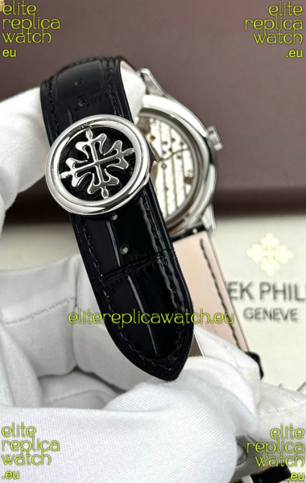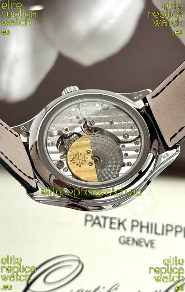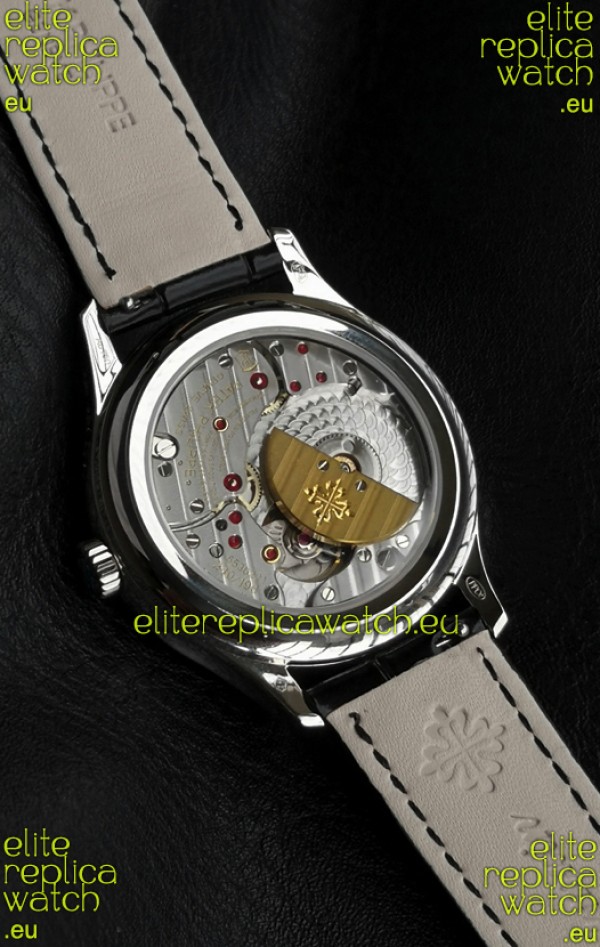 Genuine Swiss 9015 Movement assembled to Resemble the Authentic Patek Philippe PP 324 Calibre Style Movement. Updated Rotor, Bridged and Engravings on Movement with Rose Gold Plated Patek Philippe Stamped Rotor
