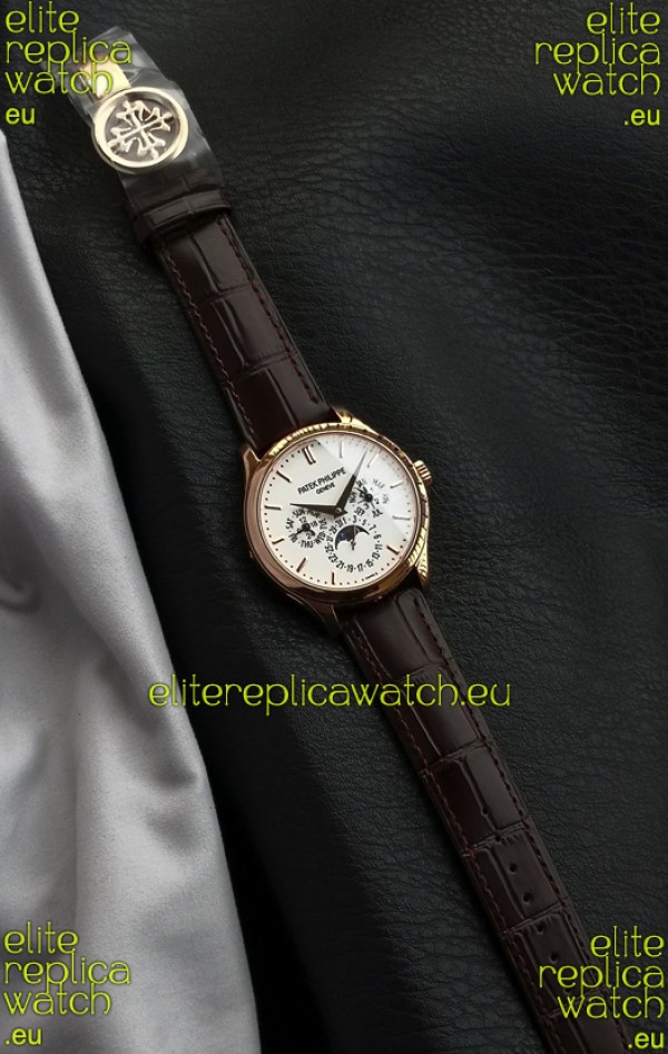 Genuine Swiss 9015 Movement assembled to Resemble the Authentic Patek Philippe PP 324 Calibre Style Movement. Updated Rotor, Bridged and Engravings on Movement with Rose Gold Plated Patek Philippe Stamped Rotor