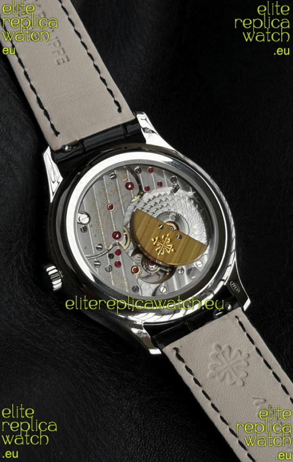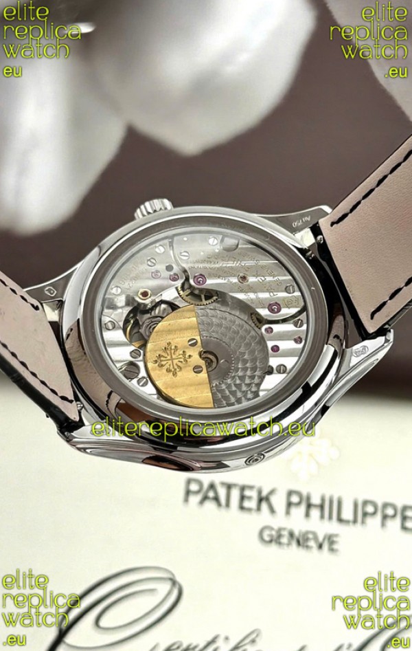 Genuine Swiss 9015 Movement assembled to Resemble the Authentic Patek Philippe PP 324 Calibre Style Movement. Updated Rotor, Bridged and Engravings on Movement with Rose Gold Plated Patek Philippe Stamped Rotor