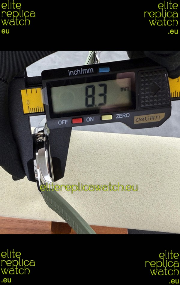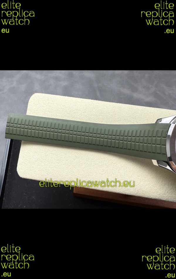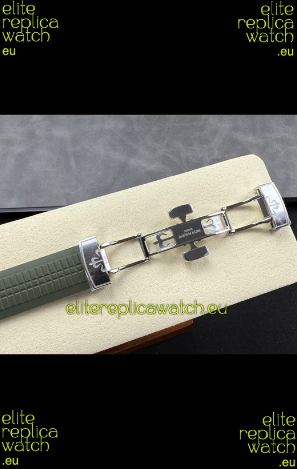 Green Curved Rubber Strap with Steel Folding Clasp complete with Patek Philippe Markings. A Highly Updated Clasps for this series with much more accurate markings/engravings.