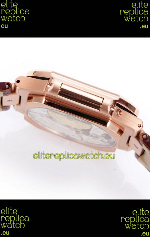 18K Rose Gold Plating on 904L Solid Stainless Steel Case with Open Case Back Cover in Steel.