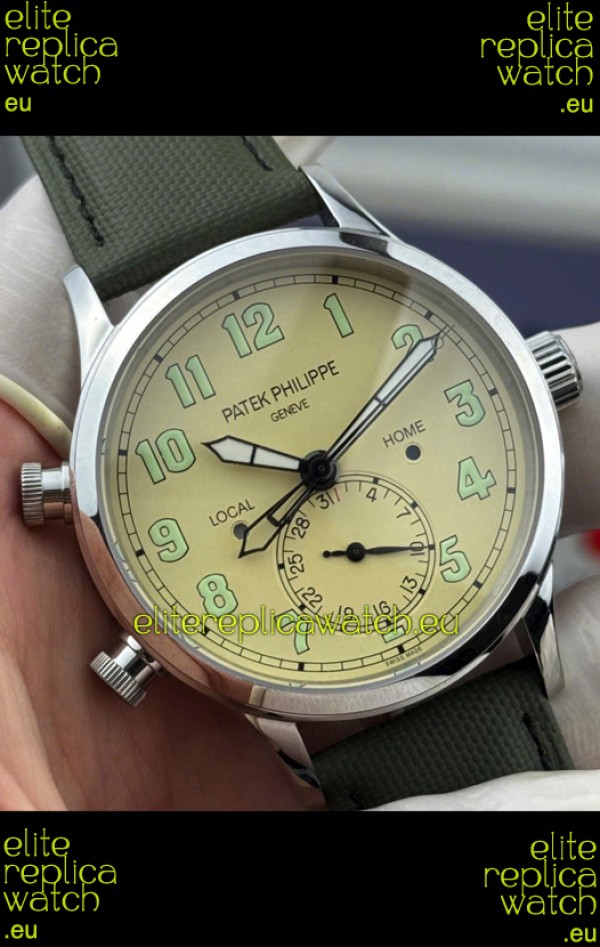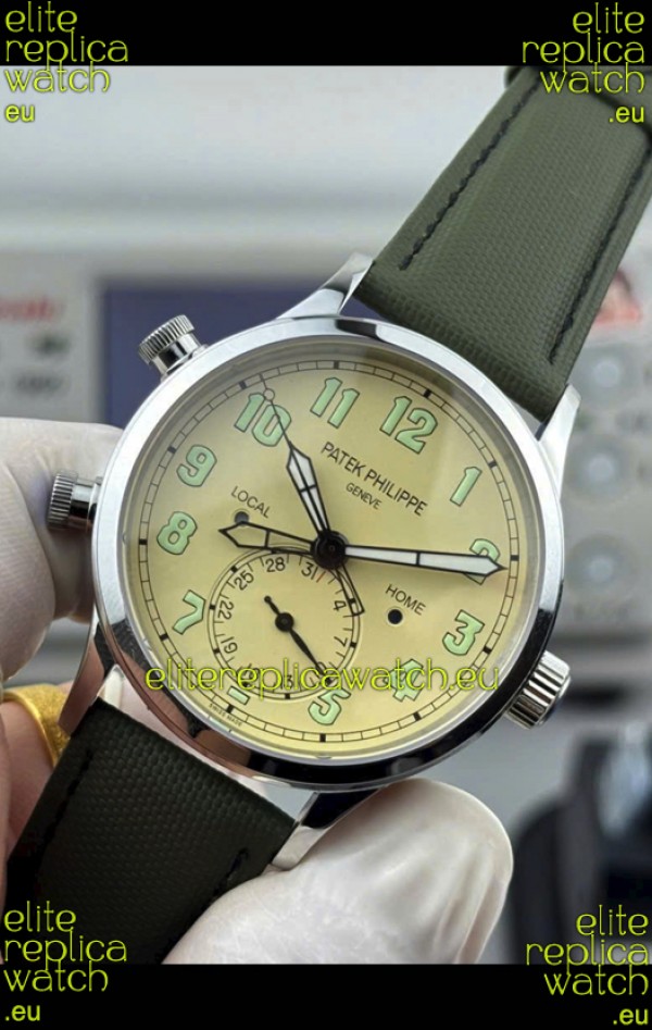 Genuine Swiss 9015 Movement assembled to Resemble the Authentic Patek Philippe PP 240 Calibre Style Movement. Updated Rotor, Bridged and Engravings on Movement with Rose Gold Plated Patek Philippe Stamped Rotor
