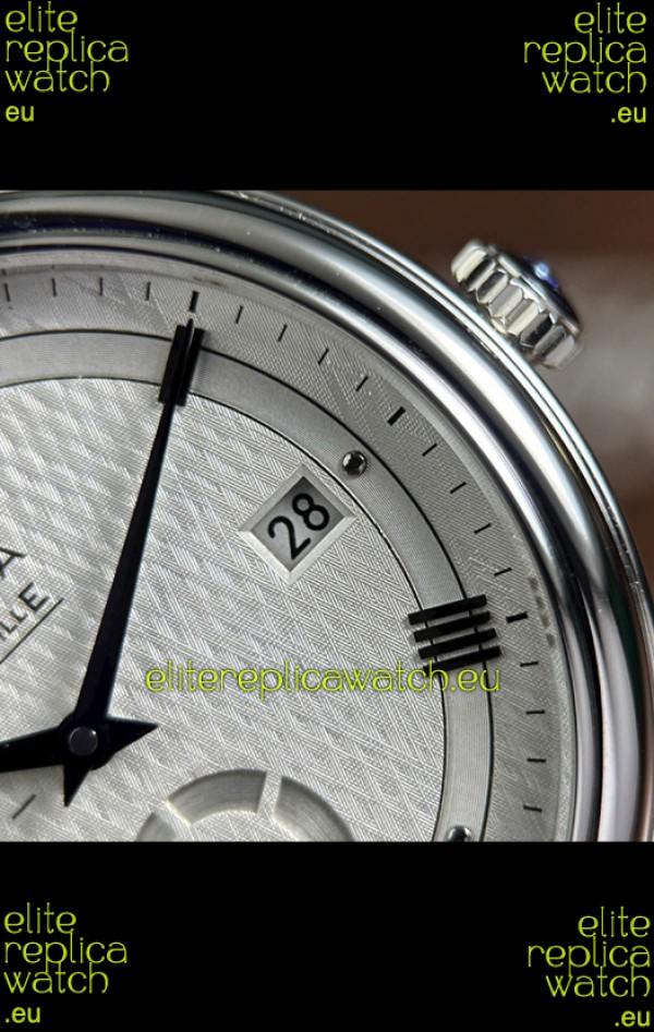 White Dial with Sub dials for Power Reserve and Seconds Hand Indicator with Date Indicator at 3 O'Clock