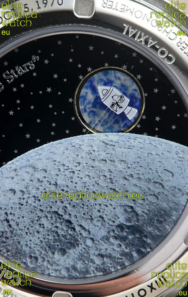 The Globe Located at the rear would rotate and complete one revolution per Minute, the Snoopy on Spaceship would rotate counter clockwise in conjunction to the Chronograph second hand once the Chronograph feature is activated.