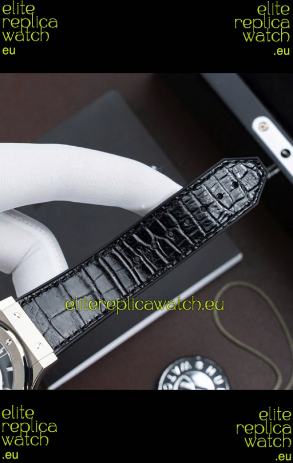 Hybrid Leather/Rubber Strap with Stainless Steel Folding Clasp complete with Hublot Markings and Engravings.