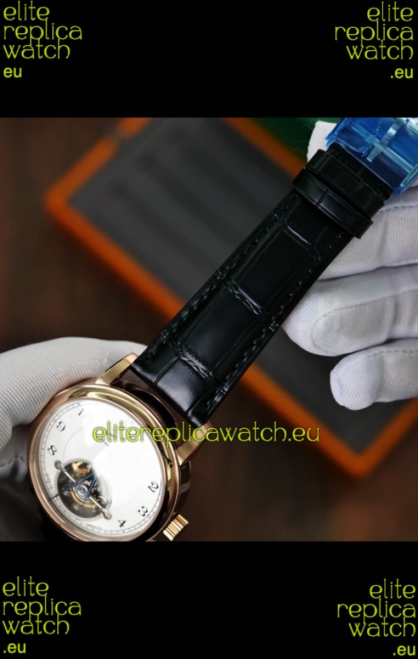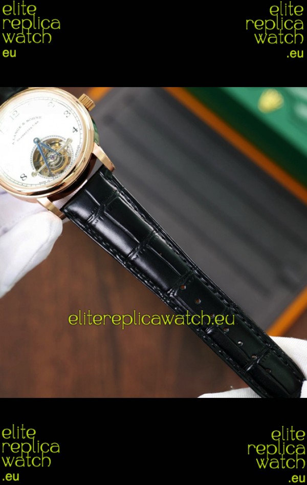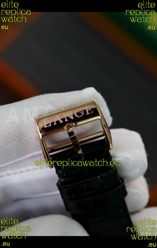 Genuine Black Leather Strap with A.Lange Sohne Stamped Markings on Strap. Polished Stainless Steel Rose Gold Clasps.