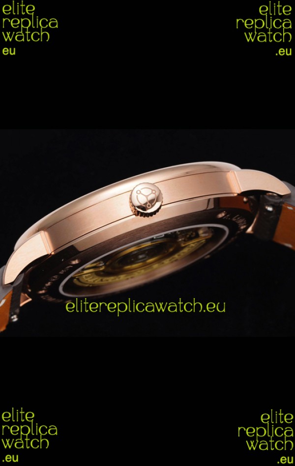 18K Rose Gold Plating on 904 Polished Solid Stainless Steel Case with Open Case Back Cover in Steel. Polished Bezel.