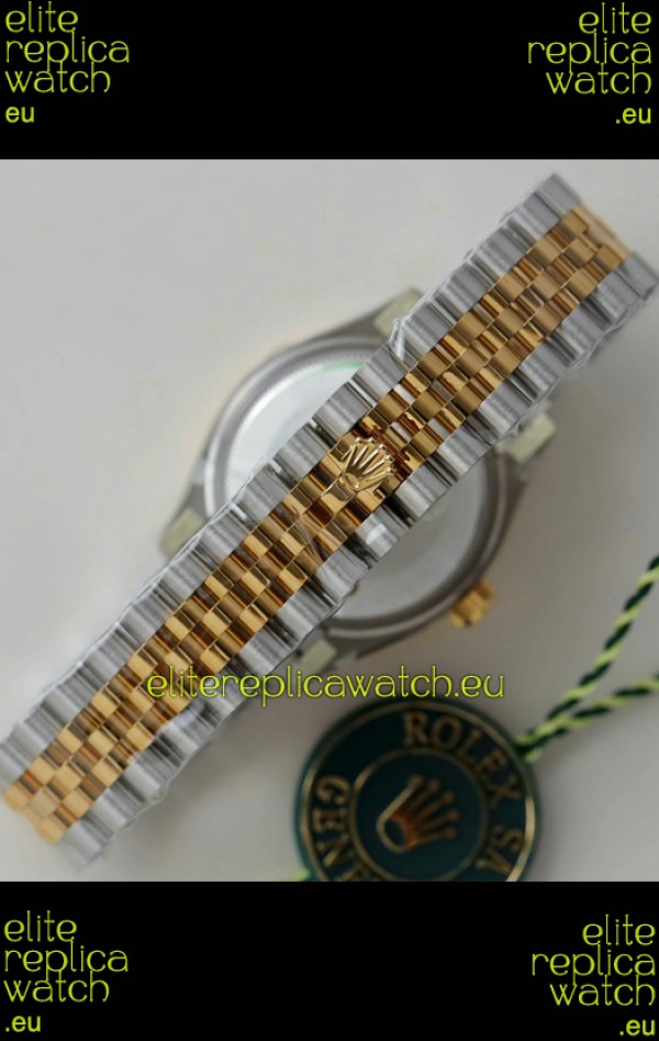 18K Yellow Gold Plating on 904L Stainless Steel Two Tone Strap with New Style Rolesor Deployant Buckle, End links match up Flush with the Case. - A Much Improved Datejust Strap Version